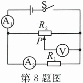 8. 如图所示,电源电压恒定不变,闭合开关 S,滑片 P 向右移动,下列说法正确的是…………………………………………………… ( )