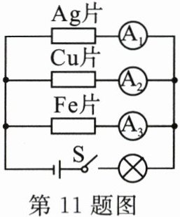 11. 某学习小组为了探究不同金属导电性强弱,进行了如图所示的实验。在金属片横截面积、长度相同的情况下,电流表 $ A_{1} $、$ A_{2} $、$ A_{3} $ 测得的电流分别为 $ I_{1} $、$ I_{2} $、$ I_{3} $,且 $ I_{1}>I_{2}>I_{3} $。则下列说法错误的是…………… ( )