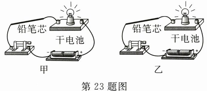 23. 铅笔芯的主要成分是石墨,不同的铅笔芯的软硬程度是不同的,小明猜想铅笔芯的电阻大小可能与其软硬程度有关,于是他选取了干电池、软硬程度不同的铅笔芯、小灯泡、开关、导线,设计实验对以上问题进行探究。