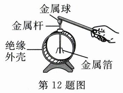 12.用毛皮摩擦过的带负电荷的橡胶棒接触验电器的金属球,验电器的金属箔张开(如图)。下列说法正确的是 ……………… ( )