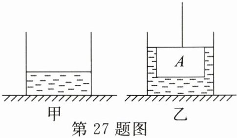 27. (6 分)如图甲所示,水平桌面上放置一个底面积为$100cm^{2}$的容器,容器内装有$500cm^{3}$的水。将一体积为$800cm^{3}$的物体 A 用细线悬挂,并浸没在水中,物体 A 的上表面和水面恰好相平,如图乙所示(柱形容器的厚度忽略不计,容器内液体没有溢出,物体未接触容器壁和容器底)。求:(g 取$10N/kg$)