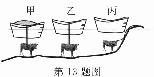 13. 宋朝的怀丙利用浮船打捞铁牛,展现了我国古人的智慧。如图为打捞过程示意图,先将陷在河底的铁牛和装满泥沙的船用绳索系在一起,再把船上的泥沙铲走,铁牛就被拉起,然后把船划到岸边,解开绳索卸下铁牛,就可将铁牛拖上岸。船在图中甲、乙、丙三个位置船所受浮力为 $F_{甲}$、$F_{乙}$、$F_{丙}$,下列判断正确的是 ……( )