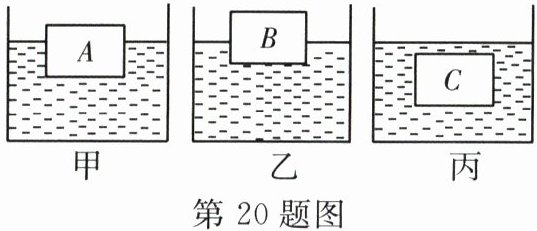 20. 如图为 $A$、$B$、$C$ 三个物体静止在甲、乙、丙三杯液体中的情形。