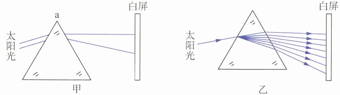 (2)太阳光射入a后被分解成七种颜色的光,在白屏上的分布如图乙所示,其中处于最上面的是( )。