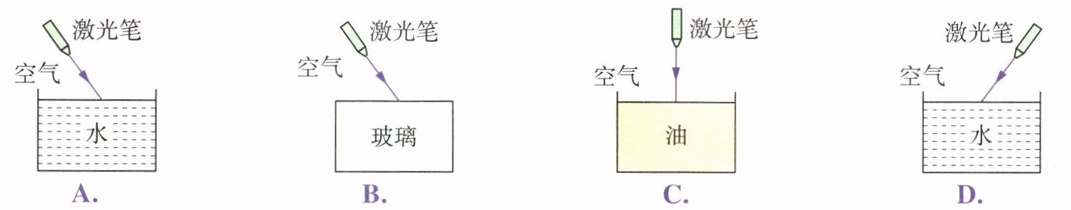 C [解析]当光从空气斜射入水或其他介质中时,光线会发生折射;当光从空气垂直射入水或其他介质中时,光的传播方向不会改变。