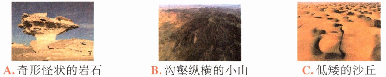 A.奇形怪状的岩石 B.沟壑纵横的小山 C.低矮的沙丘