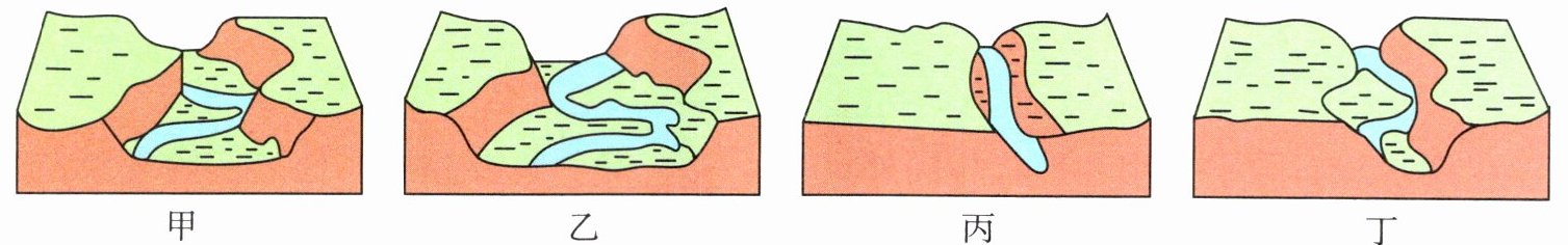 【解析】河谷形成初期,河谷较窄,然后慢慢变宽,据此可知河谷形成的顺序为丙→丁→甲→乙。