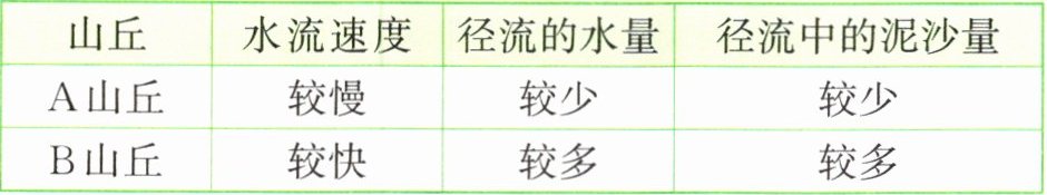 (4)从实验数据可以看出,A山丘水流速度较慢、径流的水量较少、径流中的泥沙量较少,B山丘水流速度较快、径流的水量较多、径流中的泥沙量较多。A山丘有植物覆盖,B山丘无植物覆盖,这说明植物对土壤有保护作用,而裸露的土地没有受到保护。