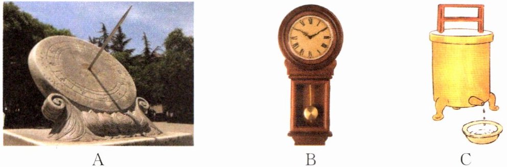 【解析】A是日晷,会受天气影响,只能在晴天计时;C是水钟,利用水流来计时;B是机械摆钟,三者中计时最为准确,机械摆钟是利用摆的等时性来计时的。