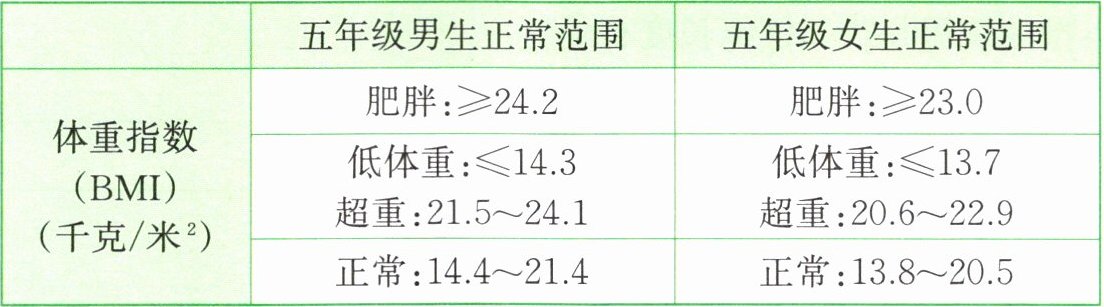 (3)A 【解析】根据体重指数的计算公式:体重指数=体重(千克)÷[身高(米)×身高(米)],可计算出豆豆的体重指数约为17.8千克/米²,对照体质健康标准中“五年级男生正常范围”一列的数据,可知其体重指数属于正常。
