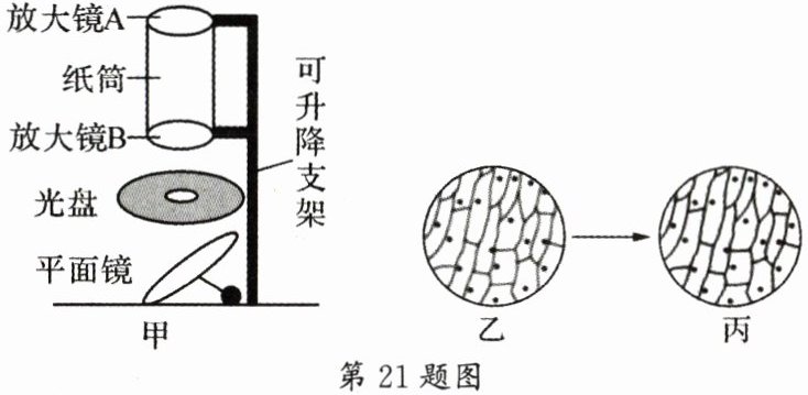 21.(6分)小科参加学校开展的“自制简易显微镜”项目化学习活动,他利用2块放大镜(A和B)、纸筒、光盘、平面镜和可升降支架等材料制作了一台“简易显微镜”(如图甲)。通过适当调节支架高度,调整标本和放大镜之间的距离,可实现与实验室光学显微镜相似的成像效果。项目化评价小组制定的“自制简易显微镜”评价表如表。