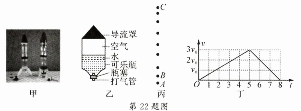 22.(6分)某项目化学习小组利用可乐瓶等材料制作水火箭(如图甲),并进行飞行高度测试实验。水火箭的结构如图乙所示。将水火箭竖立于地面,用打气筒通过打气管向瓶内打气,当瓶内压强足够大时,瓶塞脱落,瓶内的水向下喷出,水火箭就接近竖直向上飞。