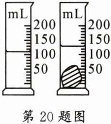 20.甲、乙两同学分别用量筒测量一个小石块的体积。甲同学的做法是在量筒里注入适量的水,记下水的体积$V_1,$然后轻轻放入石块,使量筒里的水完全浸没石块,记下此时水及石块的体积$V_2,$计算石块的体积为$V_2-V_1。$乙同学是先将石块置于量筒中,同时往量筒中注入水,使水全部浸没石块记下后水的体积$V_1,$然后取出石块,记下取出石块后水的体积$V_2,$计算石块的体积为$V_1-V_2。$比较这两种方法回答下列问题: