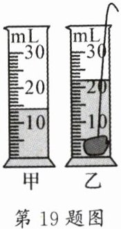 19.对于不规则物体的体积测量我们会选择排水法来测量,测量过程中:用量筒测量液体体积时,量筒必须放在水平台面上,读数时视线要与 相平。某同学测一合金块的体积如图所示,量程是 ,最小刻度是 。测量结果合金块的体积为 厘米$^3,$若某同学在测合金块体积时,把甲、乙两次次序颠倒了,则测得小石块的体积将比真实值 (填“偏大”“偏小”或“相等”)。