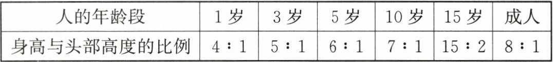 |身高与头部高度的比例|4∶1|5∶1|6∶1|7∶1|15∶2|8∶1|