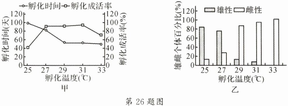 26.龟卵的孵化往往受环境温度的影响。为探究温度对某种龟卵孵化时间、孵化成活率及孵出性别的影响,研究者将数目相同的五组龟卵分别置于不同温度下孵化,结果如图所示。