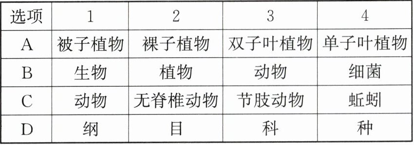 | A | 被子植物 | 裸子植物 | 双子叶植物 | 单子叶植物 |