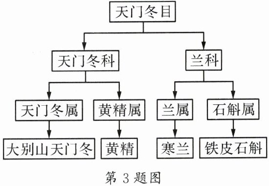 3. 2023年科考人员在湖北发现新物种,因其目前仅发现于大别山区,故将其命名为大别山天门冬。如图是部分天门冬目植物的分类等级示意图。据图分析,下列叙述错误的是( )