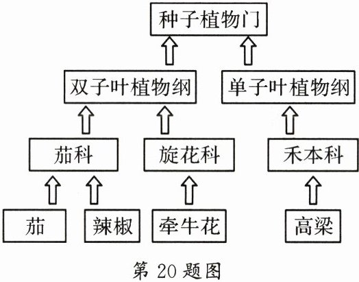 20. 如图所示是高粱、牵牛花、茄、辣椒四种植物的分类地位表,请回答以下问题。