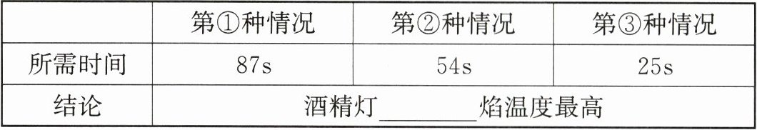 【实验与结论】取三支试管,各加入 3mL 水,①将其中一支试管的底部放在酒精灯火焰上方约 3 厘米处;②将另一支试管的底部与灯芯接触加热;③第三支试管的底部放在外焰部分加热。记录上述三种情况下将水加热至沸腾所需的时间: