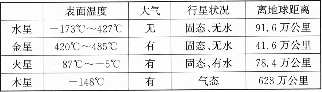 |行星|表面温度|大气|行星状况|离地球距离|