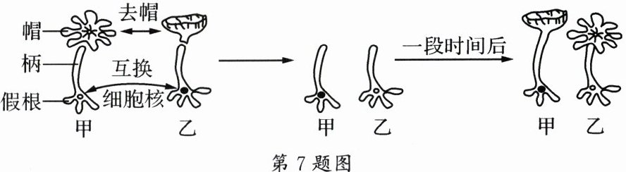 7.伞藻是一种单细胞藻类。科学家利用伞帽为菊花形的伞藻(甲)和伞帽为伞形的伞藻(乙)进行核移植实验,实验过程、结果如图。据图可知控制伞帽形状的是( )