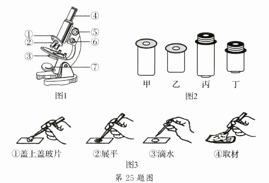 (2)图2是光学显微镜的4个镜头,甲、乙一端无螺纹,丙、丁有螺纹。若要在视野内看到最多的细胞,宜选用的镜头组合是______。