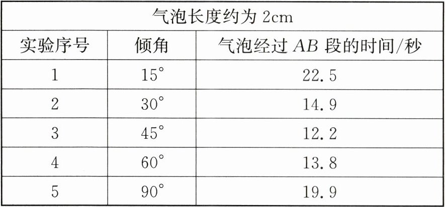 (2)分析表中的数据,可以发现气泡运动的快慢随倾角的变化关系:。
