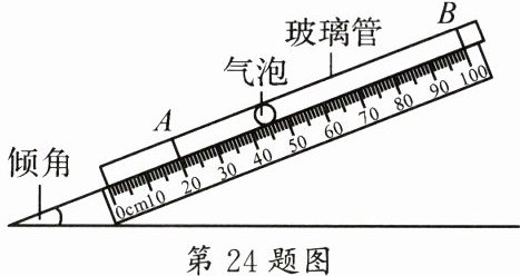 24.在研究“气泡运动规律”时,小科在细玻璃管中注入水,管中留一个小气泡,将玻璃管翻转后,观察气泡的运动情况,如图所示。气泡的运动快慢到底与哪些因素有关呢?他做出了如下猜想:猜想一:跟气泡的大小有关;猜想二:跟玻璃管与水平面的倾角有关。为了便于研究,他在玻璃管上做上记号A、B,测出气泡经过AB段的时间。实验数据记录如表。