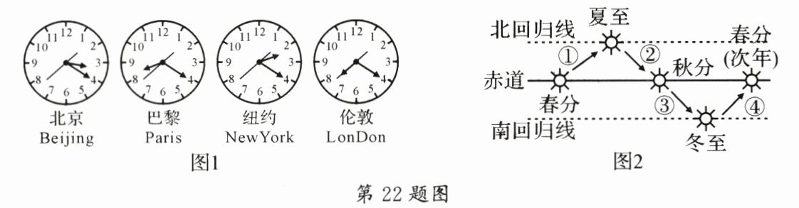 22.“五一”国际劳动节期间,长春的军军同学和家人到北京游玩。图1为军军一家5月1日入住某酒店时大堂墙上的时钟图片,图2为太阳直射点的回归运动示意图。阅读图文资料,回答下列问题。