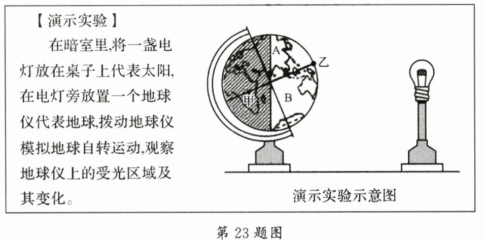 23.某班学生在学习“地球自转”时,运用地球仪做了一个演示实验。阅读演示实验方法及示意图回答: