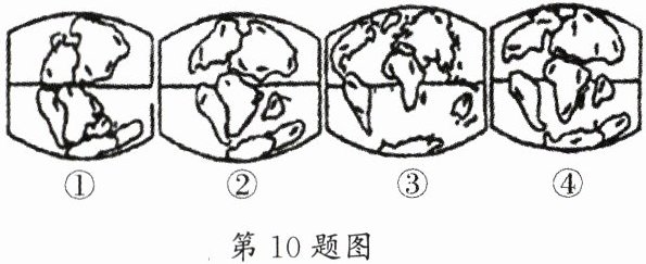 10. 右面4幅图是表示地球演变过程中海陆分布的变化情况,根据大陆漂移的假说,由早到晚的排列顺序是( )