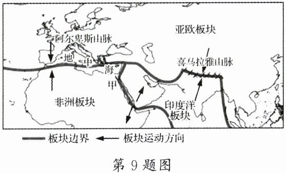 9. 读图,喜马拉雅山脉的形成是由于( )