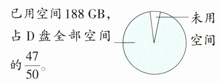 解:设D盘的全部空间为x GB。 $\frac{47}{50}x=188$ $x=200$ 200-188=12(GB) 12<15 答:他不能将文件保存到D盘。