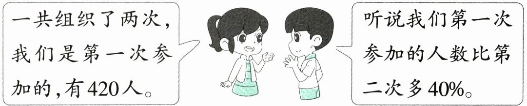 3. 研学旅行是研究性学习和旅行体验相结合的校外教育活动,是学校教育和校外教育衔接的创新形式。幸福小学组织的两次研学旅行一共有多少人参加?一共组织了两次,我们是第一次参加的,有420人。听说我们第一次参加的人数比第二次多40%。
