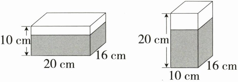 1. (名校期末真题)有一个完全封闭的长方体容器,从里面量,长20厘米,宽16厘米,高10厘米。平放时容器内水面高7厘米(左图)。如果把这个容器竖起来放(右图),水面的高度是多少厘米?(5分)