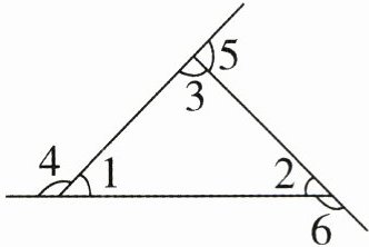 提示:∠1与∠4,∠2与∠6,∠3与∠5都拼成了一个平角,即180°,且∠1+∠2+∠3=180°,所以∠4+∠5+∠6=180°×3−180°=360°。