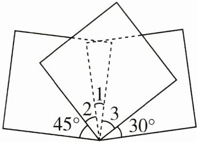 提示:从题图中可以看出,∠1+∠2=90°−45°=45°,∠1+∠3=90°−30°=60°,那么45°+60°=105°是∠1,∠2,∠3三个角的度数和再加上∠1 的度数,因为∠1,∠2,∠3拼起来正好是一个直角,所以用105°减去90°就是∠1的度数。