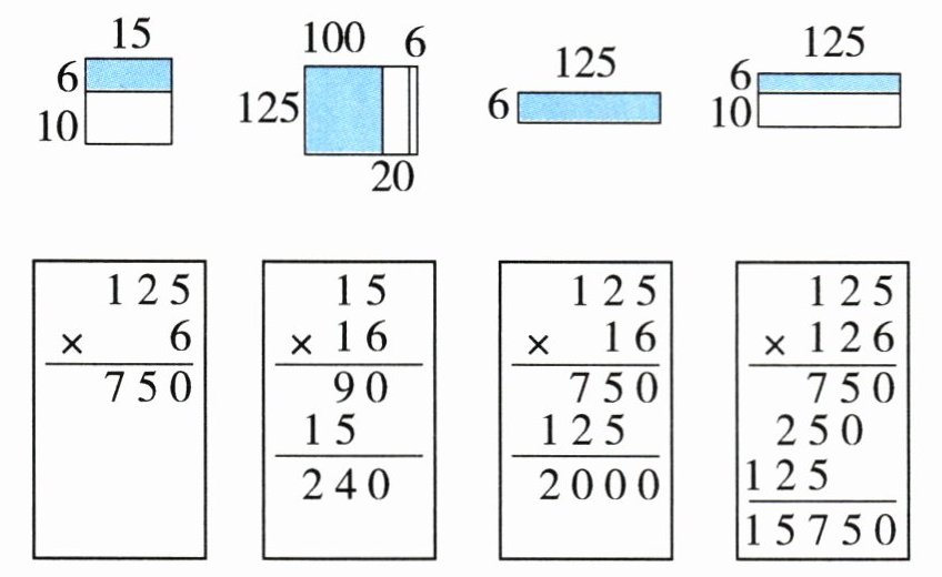 $\boxed{\begin{array}{r} 125\\ ×\quad6\\ \hline 750\end{array}}$ $\boxed{\begin{array}{r} 15\\ ×\quad16\\ \hline 90\\ 15\quad\\ \hline 240\end{array}}$ $\boxed{\begin{array}{r} 125\\ ×\quad16\\ \hline 750\\ 125\quad\\ \hline 2000\end{array}}$ $\boxed{\begin{array}{r} 125\\ ×\quad126\\ \hline 750\\ 250\quad\\ 125\quad\quad\\ \hline 15750\end{array}}$