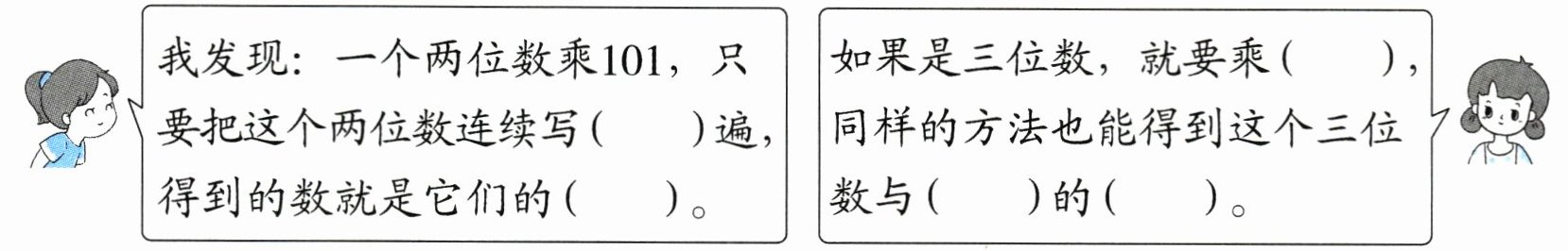[左边对话框]我发现:一个两位数乘101,只要把这个两位数连续写(______)遍,得到的数就是它们的(______)。