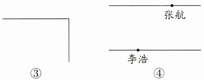 (4)如图④,如果李浩要到马路对面,怎样走路线最短?用红笔画一画。如果李浩要走到张航的位置,怎样走路线最短?用蓝笔画一画。