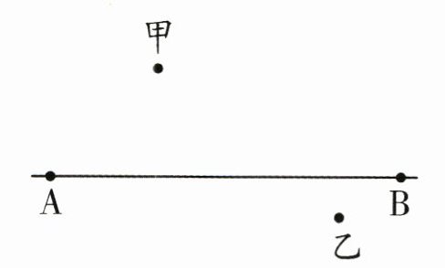 4. 如图,一辆汽车在笔直的公路上从A地向B地行驶,当汽车分别行驶到何处时,分别对甲、乙两所学校造成的影响最大?把这两个点画出来。