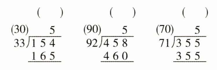 (30)$\begin{array}{r} 5 \\ 33 \enclose{longdiv}{154} \\ \underline{165} \\ \end{array}$ (90)$\begin{array}{r} 5 \\ 92 \enclose{longdiv}{458} \\ \underline{460} \\ \end{array}$ (70)$\begin{array}{r} 5 \\ 71 \enclose{longdiv}{355} \\ \underline{355} \\ \end{array}$