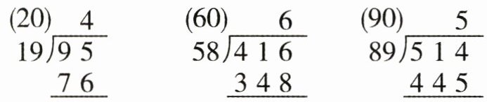 (20)$\begin{array}{r} 4 \\ 19 \enclose{longdiv}{95} \\ \underline{76} \\ \end{array}$ (60)$\begin{array}{r} 6 \\ 58 \enclose{longdiv}{416} \\ \underline{348} \\ \end{array}$ (90)$\begin{array}{r} 5 \\ 89 \enclose{longdiv}{514} \\ \underline{445} \\ \end{array}$