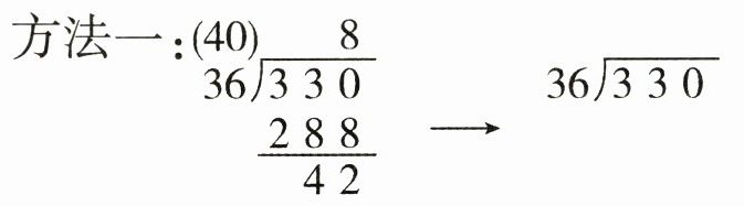 方法一:(40)$\begin{array}{r} 8\\ 36\enclose{longdiv} {330}\\ 288\\ \hline 42\end{array}$→$36\enclose{longdiv} {330}$