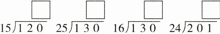 $\begin{array}{r} □\\ 15\enclose{longdiv} {120}\end{array}$ $\begin{array}{r} □\\ 25\enclose{longdiv} {130}\end{array}$ $\begin{array}{r} □\\ 16\enclose{longdiv} {130}\end{array}$ $\begin{array}{r} □\\ 24\enclose{longdiv} {201}\end{array}$