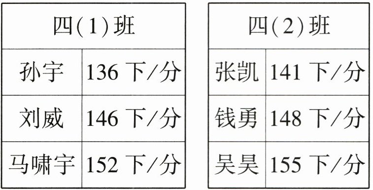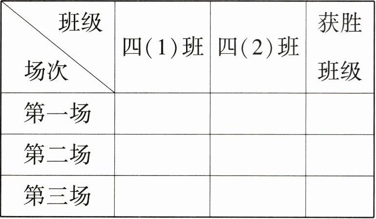 4. 四(1)班和四(2)班举行一分钟跳绳比赛,每班各选3名选手一对一比赛,采取三场两胜制。下面是两个班选手的成绩: