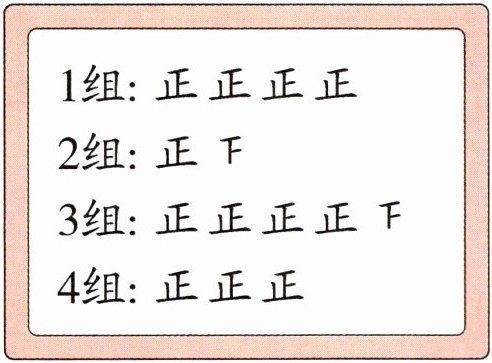 1. 二(1)班进行“最棒小组”评比,老师在黑板上写“正”字计分,一笔代表一分。