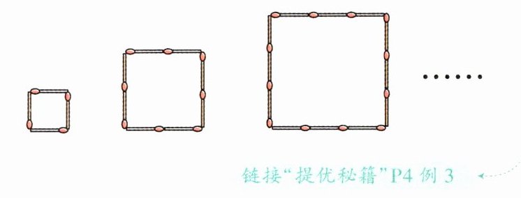 提示:观察题图,第1幅图每边1根火柴棒,4条边共4根火柴棒,列式为1×4=4(根);第2幅图每边2根火柴棒,4条边共8根火柴棒,列式为2×4=8(根);第3幅图每边3根火柴棒,4条边共12根火柴棒,列式为3×4=12(根);照此规律,第5幅图每边5根火柴棒,求火柴棒总根数列式为5×4=20(根)。第6幅图每边6根火柴棒,求火柴棒总根数列式为6×4=24(根)。