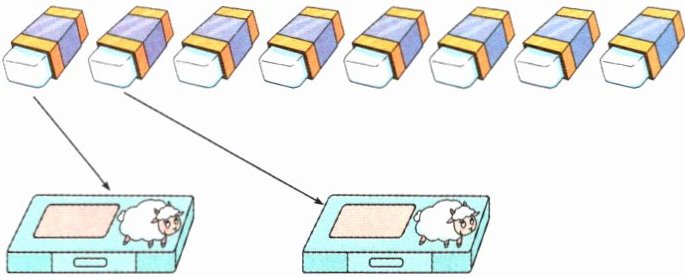 把 8 块橡皮,平均放入 2 个铅笔盒里,每个铅笔盒里放(